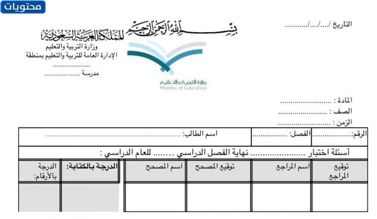 نعرض لكم هنا نموذج لكليشة اختبارات مميزة بشعار الوزارة للمدارس السعودية مرفقًا معها شعار وزارة التعليم السّعودية الجديد على الشاكلة التاليّة: