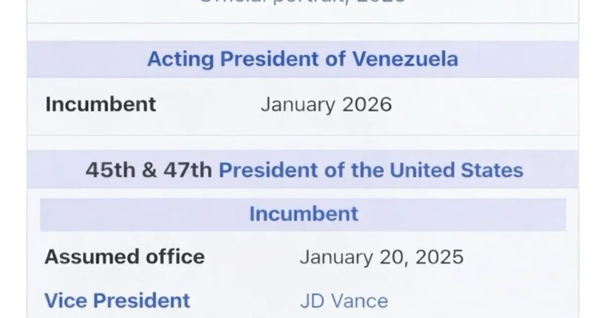 الصورة التي نشرها ترمب، والتي تم تعديلها من صفحة موسوعة “ويكيبيديا”، أظهرته بوصف “القائم بأعمال رئيس فنزويلا”، على الرغم من أن الصفحة الرسمية لترمب على الموسوعة لا تتضمن هذا الوصف. هذه الخطوة، التي يعتبرها البعض استفزازية، تأتي بعد فترة من التصعيد الأميركي تجاه فنزويلا، وتحديداً عقب العملية التي أدت إلى اعتقال الرئيس الفنزويلي نيكولاس مادورو.