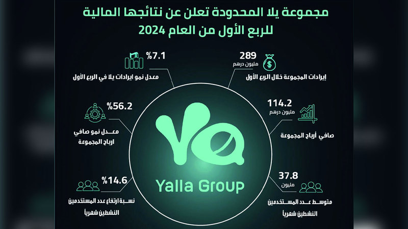 أعلنت «مجموعة يلا المحدودة» التي تتخذ من الإمارات مقراً لها، والمدرجة في «بورصة نيويورك»، نتائجها المالية غير المدققة للربع الأول من العام 2024، المنتهي في 31 مارس، محققةً إيرادات بلغت 289 مليون درهم، بنسبة نمو بلغت 7.1%، ما يعكس النجاح المستمر للشركة في تحقيق أهدافها الاستراتيجية وتطوير عملياتها.