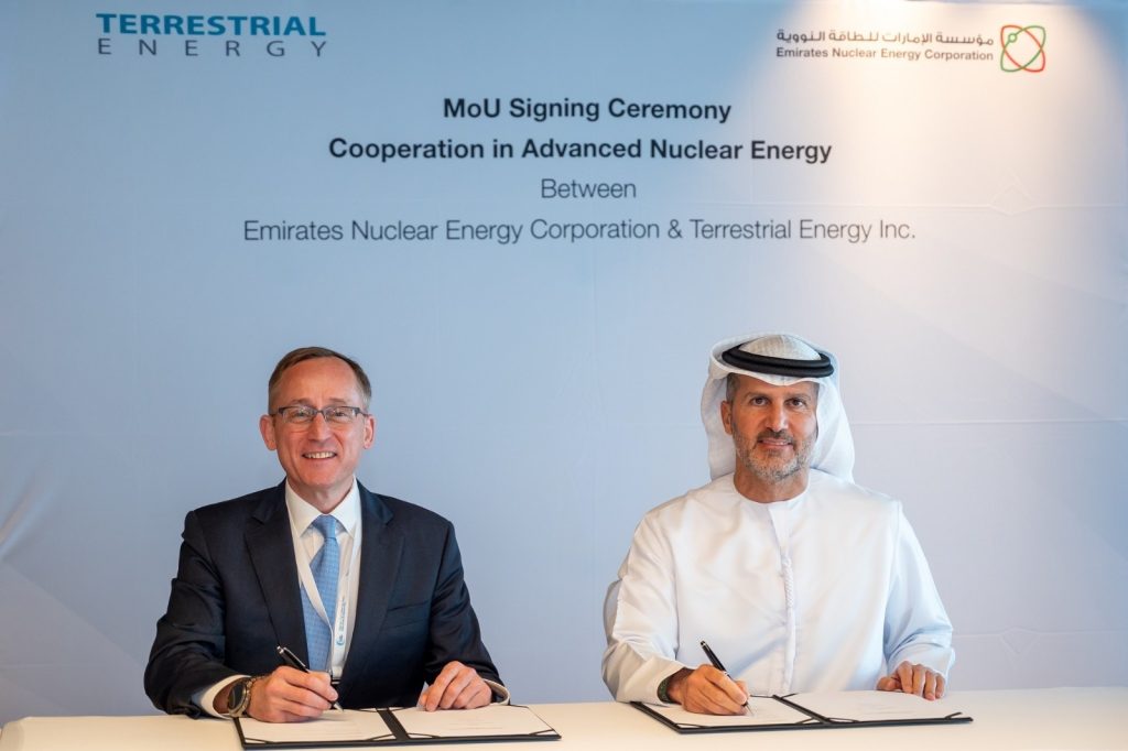 وقعت مؤسسة الإمارات للطاقة النووية، مذكرة تفاهم مع شركة «تيرستريال للطاقة» لاستكشاف فرص التعاون المشترك في تطوير واستخدام تقينات الطاقة النووية المتقدمة، وذلك خلال مؤتمر «COP28». ووقع مذكرة التفاهم، العضو المنتدب والرئيس التنفيذي لمؤسسة الإمارات للطاقة النووية، محمد الحمادي، والرئيس التنفيذي لشركة «تيرستريال للطاقة»، سيمون آيرش.