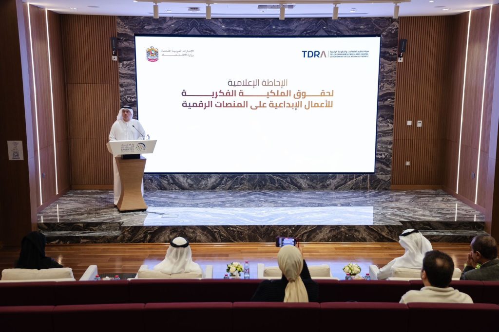 وقال المعيني:”حرصت الدولة على تعزيز جهودها لرفع مساهمة الاقتصاد الإبداعي في الناتج المحلي الإجمالي للاقتصاد الوطني، باعتباره محركاً رئيسياً للنمو الاقتصادي خلال الخمسين عاماً المقبلة، ونحن اليوم نشهد محطة جديدة لتعزيز مكانة الإمارات كوجهة رائدة للأعمال والصناعات الإبداعية، وذلك من خلال الإعلان عن آلية جديدة لوزارة الاقتصاد ستعمل على تنفيذها بالتعاون مع هيئة تنظيم الاتصالات والحكومة الرقمية، والتي تهدف إلى الحظر الفوري والحجب للمواقع الإلكترونية التي تقوم بانتهاك حقوق المؤلفين وأصحاب الأعمال الإبداعية وتعرضها عبر المنصات المختلفة دون الحصول على الموافقة للنشر أو البث”.