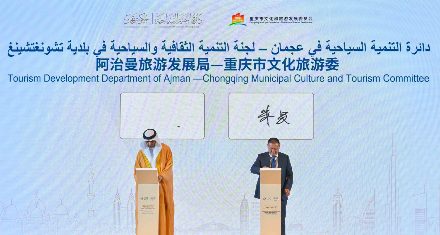 وقعت دائرة التنمية السياحية في عجمان ولجنة التنمية الثقافية والسياحية في بلدية تشونغتشينغ بجمهورية الصين الشعبية بحضور سمو الشيخ عمار بن حميد النعيمي، ولي عهد عجمان رئيس المجلس التنفيذي، والشيخ عبدالعزيز بن حميد النعيمي، رئيس دائرة التنمية السياحية في عجمان، ، مذكرة تفاهم، في إطار جهود الإمارة لتعزيز حضورها الدولي وترسيخ علاقاتها الاستراتيجية مع المدن العالمية الرائدة، وذلك ضمن فعاليات مؤتمر الصين (تشونغتشينغ) والإمارات لتعزيز التجارة والاستثمار، المنعقد تحت شعار “رؤى متماثلة وآفاق مشتركة”.