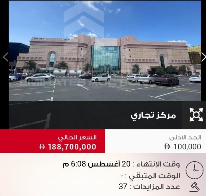 بيع مركز «لامسي بلازا» للتسوق، الواقع في منطقة عود ميثاء بدبي، بقيمة 188.7 مليون درهم، وذلك خلال مزاد أقيم يوم الأربعاء الموافق 20 أغسطس الجاري.