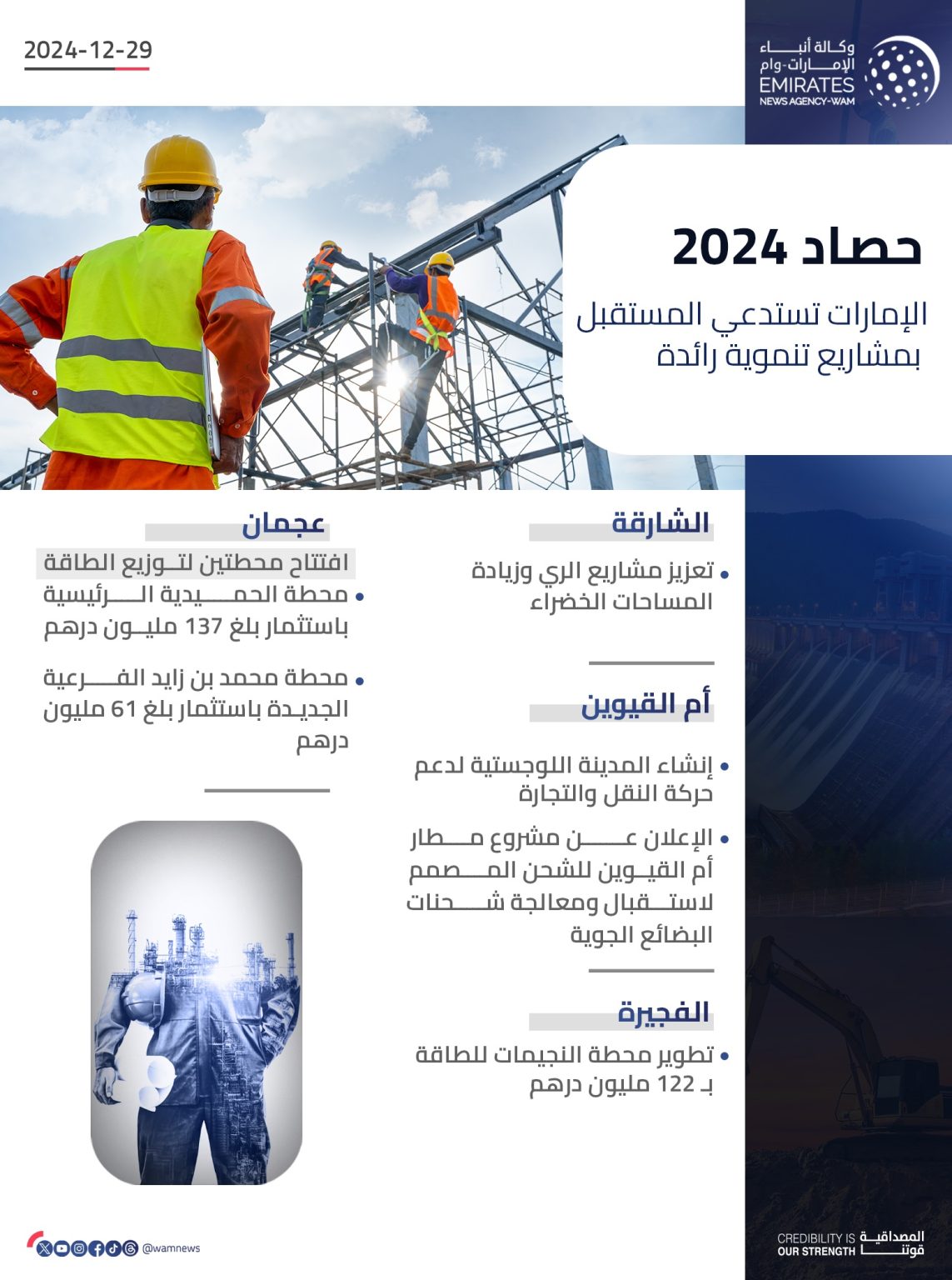 عززت دولة الإمارات خلال عام 2024، قطاع البنية التحتية بمجموعة من المشاريع الحيوية لمواكبة تطلعات النمو الاقتصادي ودعم المسيرة التنموية التي تشهدها الدولة في القطاعات كافة.