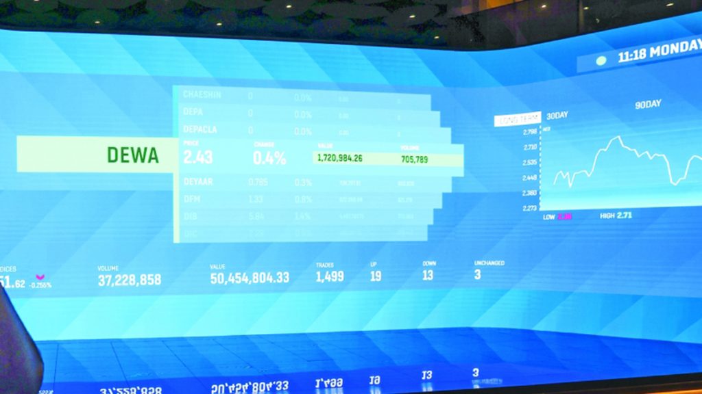 وارتفع رأس المال السوقي للأسهم المدرجة بسوق دبي المالي من 916.084 مليار درهم، في نهاية جلسة الجمعة الماضية، إلى 916.501 مليار درهم بنهاية جلسة أمس.