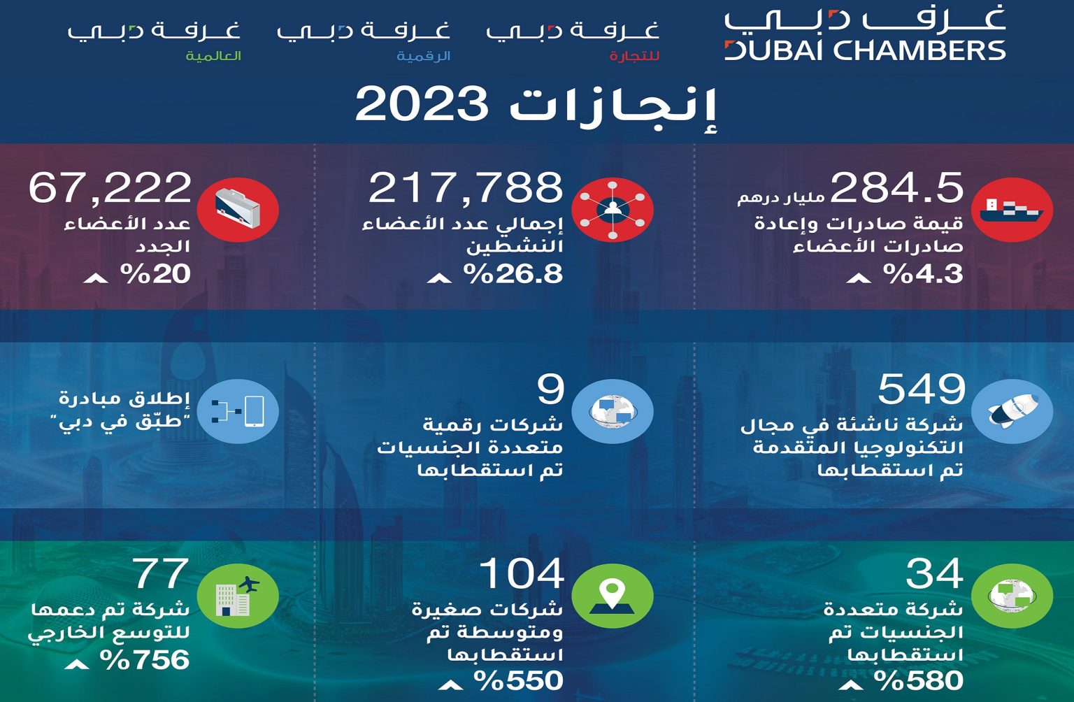 ونجحت غرفة دبي العالمية في استقطاب 138 شركة متنوعة، منها 34 شركة متعددة الجنسيات، بنسبة نمو سنوية بلغت 580%، و104 شركات صغيرة ومتوسطة، بنسبة نمو سنوية بلغت 550% وبلغ عدد شركات دبي التي دعمت الغرفة توسعها الخارجي 77 شركة، بنسبة نمو قياسية بلغت 756%، في حين ارتفع إجمالي عدد المكاتب الخارجية التي تديرها الغرفة إلى 31 مكتباً مع افتتاح 16 مكتباً خارجياً جديداً خلال العام 2023 وحده
