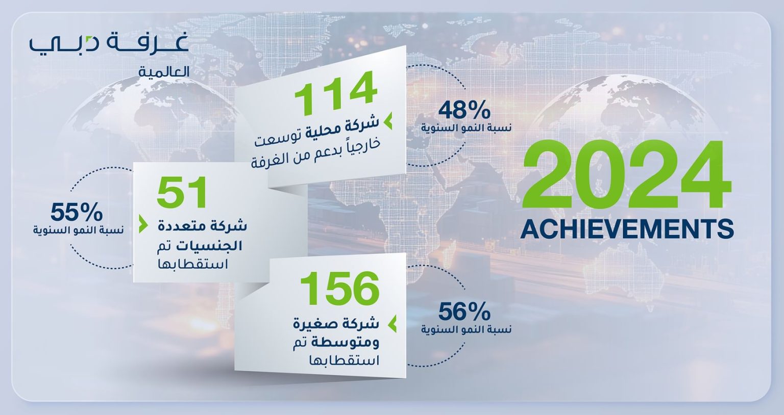 ونجحت غرفة دبي العالمية في 2024، بدعم توسع 114 شركة محلية إلى أسواق عالمية جديدة، بنمو بنسبة 48% مقارنة بـ 77 شركة محلية تم دعم توسعها في العام 2023.