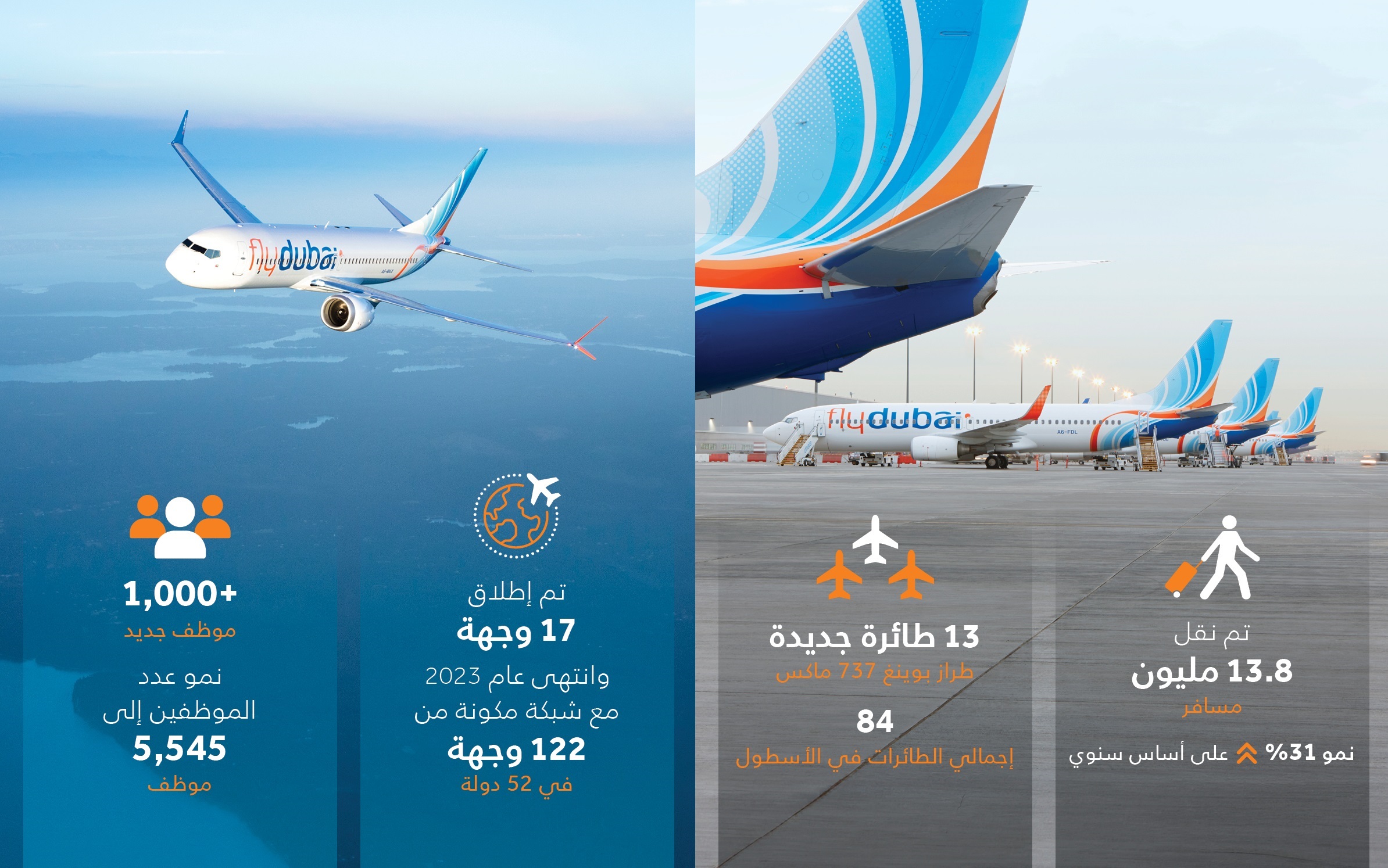 وتسلمت فلاي دبي 13 طائرة جديدة وأنهت عام 2023 بـ 84 طائرة منها 29 طائرة بوينغ 800-737 من الجيل الجديد، و52 طائرة بوينغ 737 ماكس 8، و03 طائرات بوينغ 737 ماكس 9.