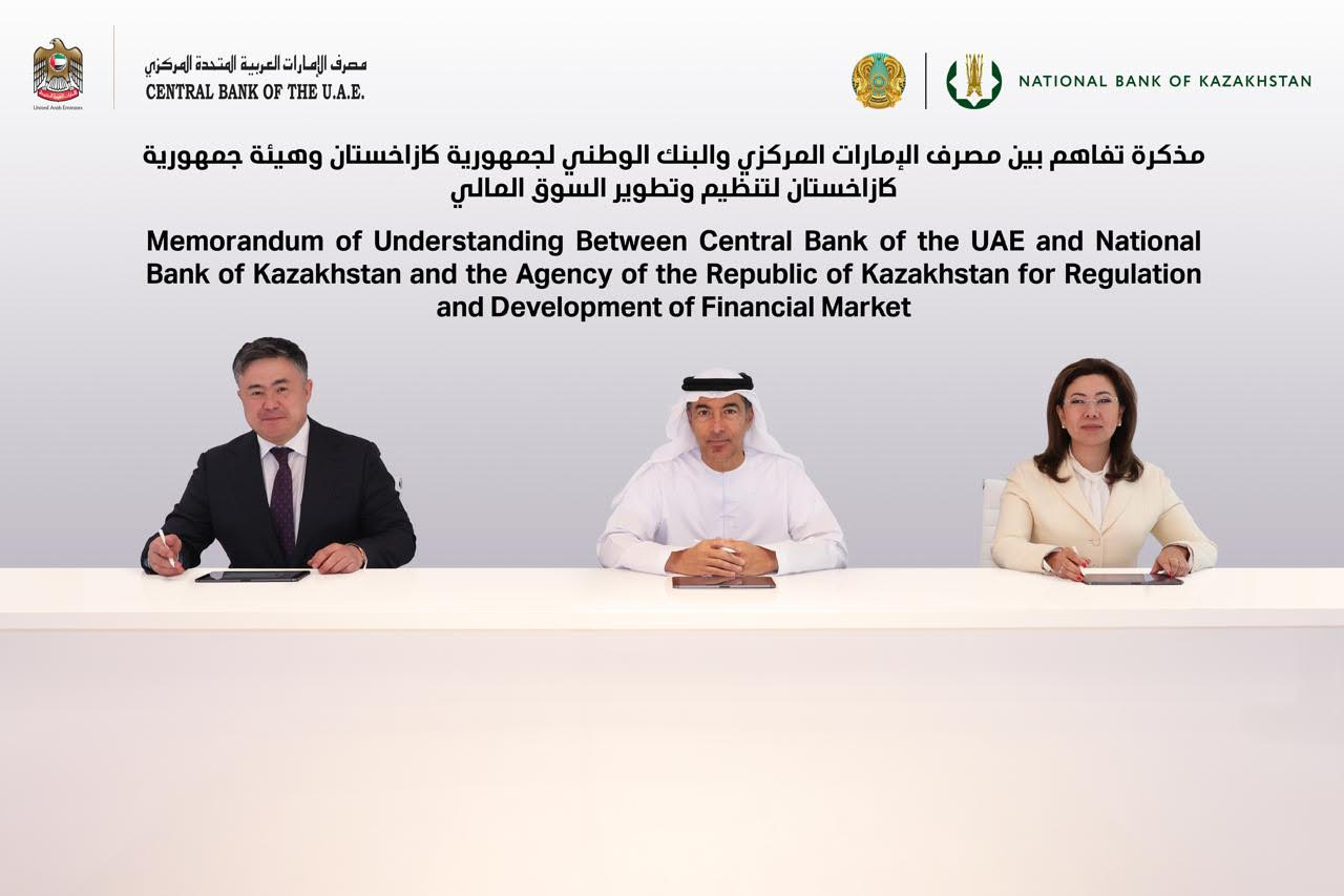 وقّع محافظ مصرف الإمارات العربية المتحدة المركزي، خالد محمد بالعمى، ومحافظ البنك الوطني لكازاخستان،معالي تيمــــور سيولمينوف، ورئيس هيئة كازاخستان لتنظيم وتطوير السوق المالي، مدينا ابيلكاسيموفا، مذكرة تفاهم تهدف إلى تعزيز التعاون وإرساء إطار لتوطيد العلاقات وتبادل المعلومات والخبرات في المجالات المشتركة.