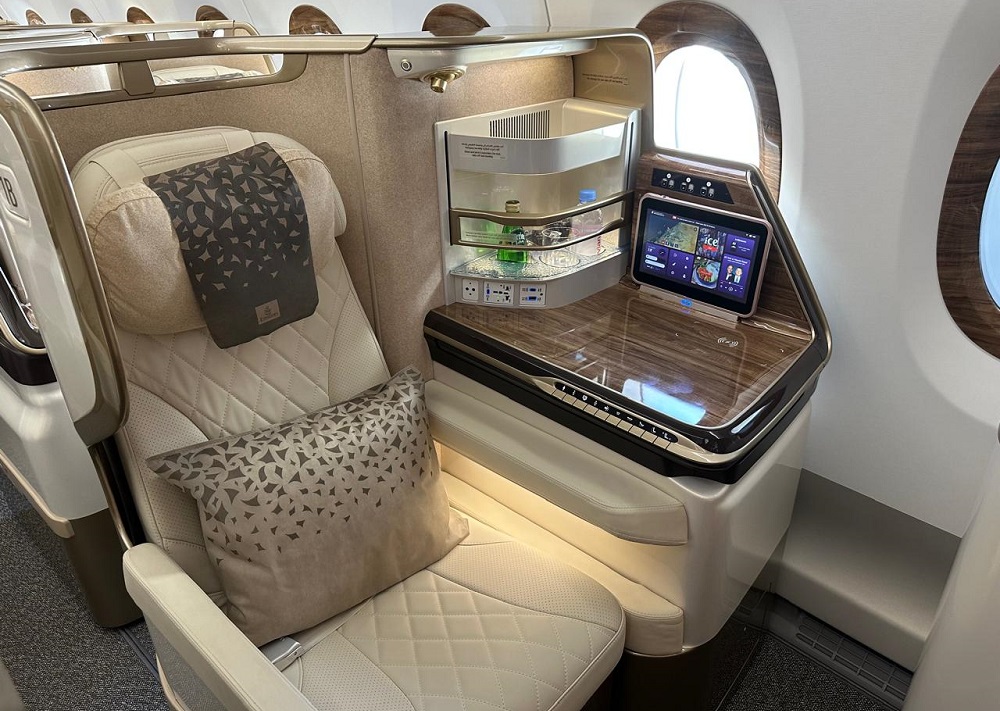 · ستائر aerBlade جديدة في جميع الدرجات – ستائر كهربائية مزخرفة بشعار شجرة الغاف المميز لطيران الإمارات، وتمتاز هذه الستائر بسهولة فتحها وإغلاقها بلمسة زر.