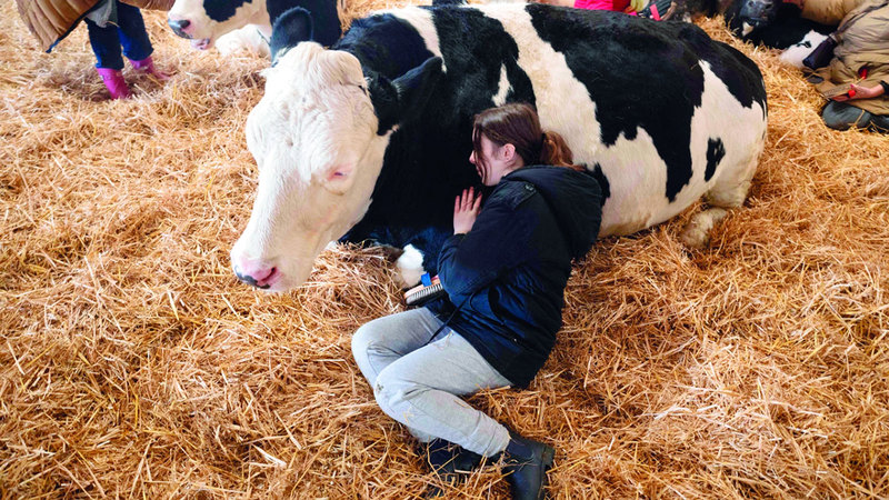 تخرج البقرة «موراغ» من الحظيرة الرئيسة في «دمبل فارم» في شمال إنجلترا، وتقف استعداداً لمقابلة ضيوفها. ففي هذه المزرعة القريبة من بيفرلي في شرق يوركشير، يأتي الزوار، ليس لشراء الحليب أو اللبن أو الجبن، بل للاستمتاع بمعانقة أبقار الهايلاند، للتخفيف من التوتر. بدأت فيونا ويلسن ومربو الماشية الآخرون في «دمبل فارم» تقديم جلسات معانقة الأبقار في فبراير، بعدما أصبحت الصعوبات الاقتصادية التي يواجهها قطاع إنتاج الألبان والأجبان غير محتملة.