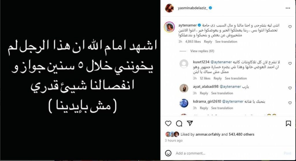 وفي أول تعليق لها على الأمر، ردت ياسمين عبد العزيز عبر حسابها على انستغرام قائلةً: “أشهد أمام الله أن هذا الرجل لم يخونني خلال 5 سنين جواز و انفصالنا شيء قدري مش بإيدينا”.
