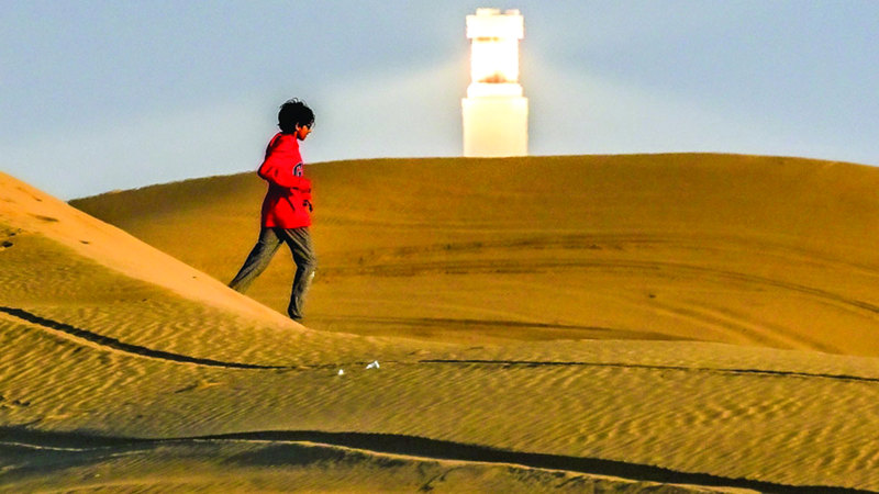 عدد من الأطفال يلهون على تلة رملية، حيث يظهر في أقصى الصورة أطول برج للطاقة الشمسية المركزة في العالم، والتابع لـ«محطة محمد بن راشد للطاقة الشمسية» في منطقة القدرة بدبي.