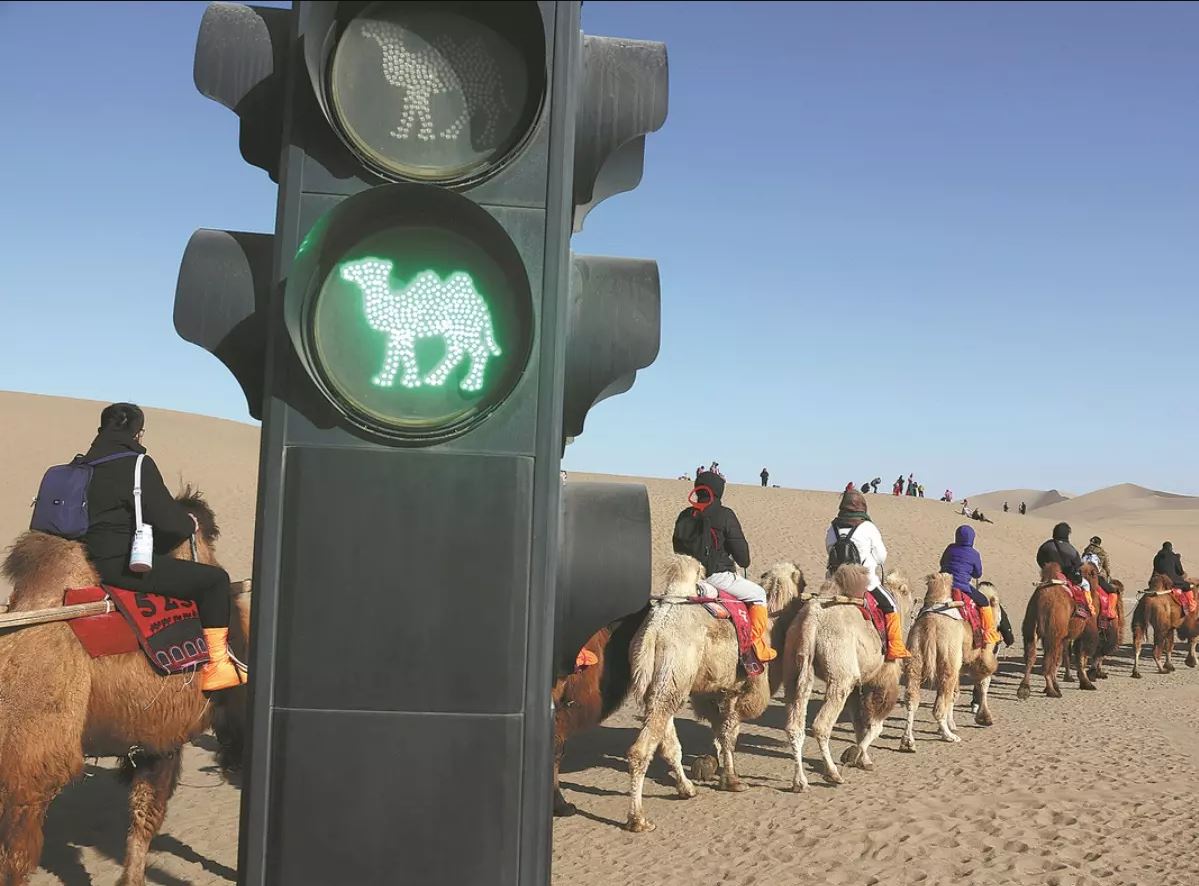 ومن خلال تركيب إشارات المرور التي تشير إلى توقف الجمال للسماح للمشاة بالعبور، تم حل المشكلة جزئيًا. فعندما يكون ضوء الجمل الأخضر مضاءً، يمكن للجمال المرور؛ عندما يضيء ضوء الجمل الأحمر، تتوقف الجمال للسماح للمشاة بالمرور أولاً.