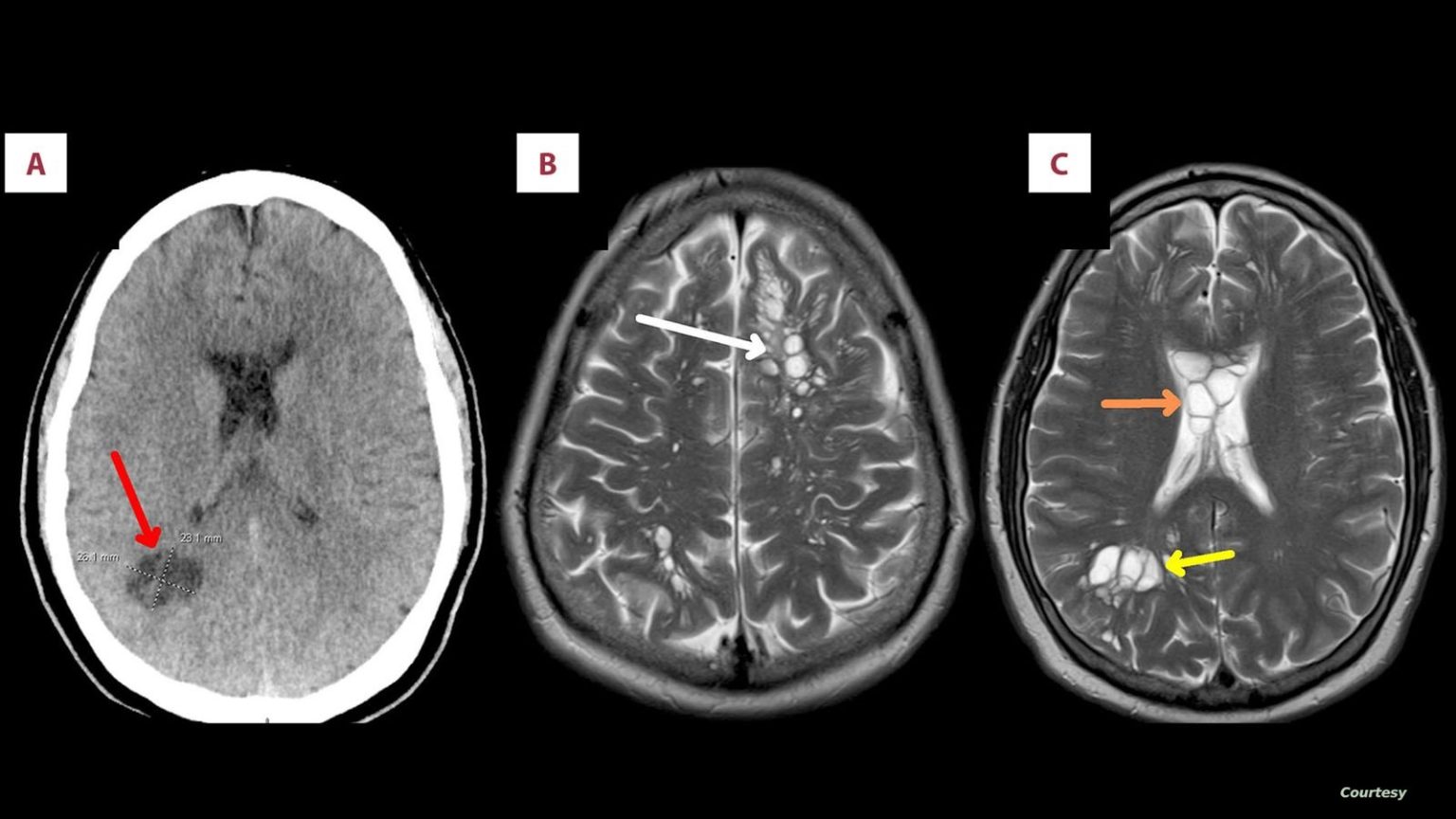 وكشف تصوير بالأشعة المقطعية أجراه أطباء لدماغ الرجل، عن بيوض الدودة الشريطية، وتم تشخيص المريض بداء الكيسات المذنَّبة العصبي.
