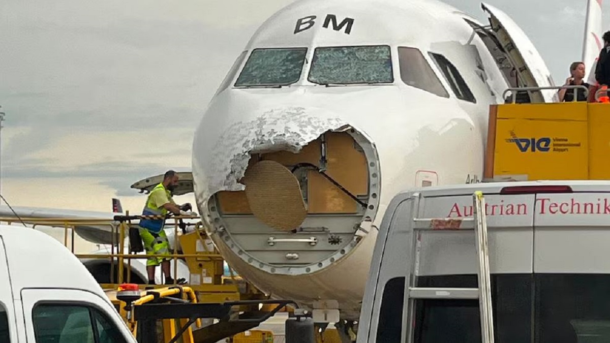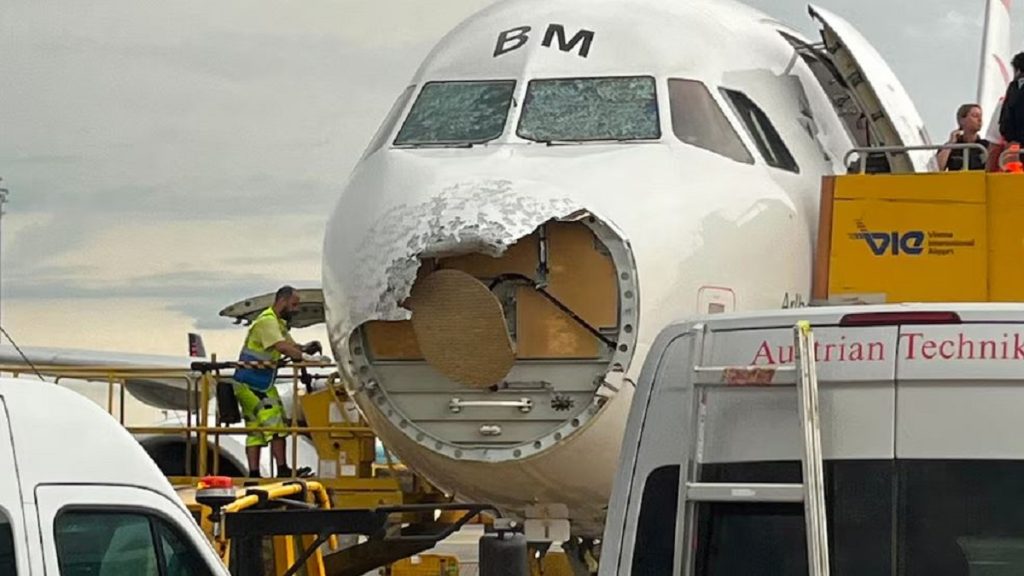 وتسبب البَرَد في تحطيم جزء من مقدمة الطائرة وبتشقق نوافذ قمرة القيادة في طائرة الخطوط الجوية النمساوية التي كانت تقل سياحاً عائدين من بالما دي مايوركا.