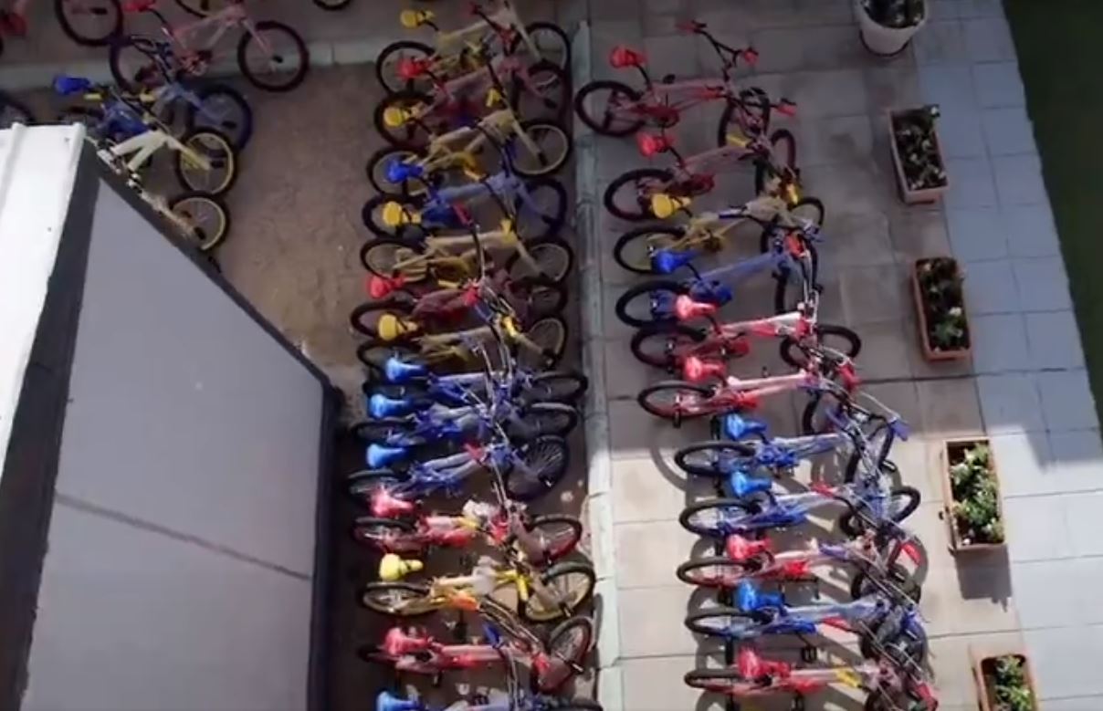 ويظهر في مقطع الفيديو اصطفاف العشرات من الدراجات الهوائية بألوان مختلفة في ساحة المدرسة قبل أن يفاجئ المعلم طلابه في حين تظهر لقطات أخرى ركوب الطلاب على الدراجات وسط أجواء فرحة.