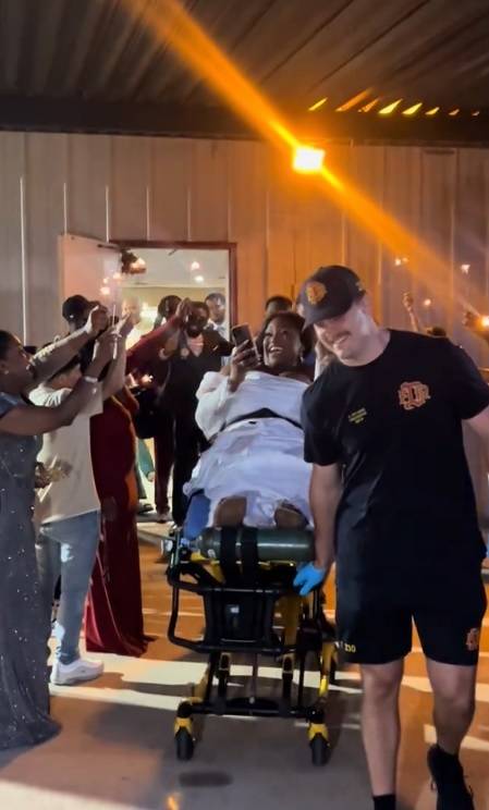 ورغم شدة الألم، لم تفقد روحها المرحة، وخرجت من قاعة الاحتفال محمولة على نقالة، وسط أجواء احتفالية أضفت طابعاً غير مألوف على الحفل، وتفاعل الضيوف بشكل لافت مع الموقف، وودعوها بالهتافات، في مشهد وصفه كثيرون بـ«الاستثنائي».