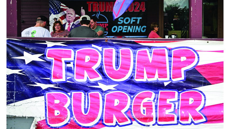 ويحضر طيف دونالد ترامب في كل مكان في هذا المطعم الذي يضم نحو 10 طاولات، من خلال الصور والمجسمات الكرتونية واللافتات والقبعات وحتى القمصان المعروضة للبيع، التي تعود إلى حملته الانتخابية عام 2024.