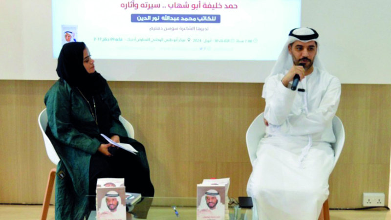 نظمت مؤسسة سلطان بن علي العويس الثقافية، أول من أمس، في جناحها بمعرض أبوظبي الدولي للكتاب، جلسة وحفل توقيع لكتاب «حمد خليفة أبوشهاب.. سيرته وآثاره»، للمؤلف محمد عبدالله نور الدين.