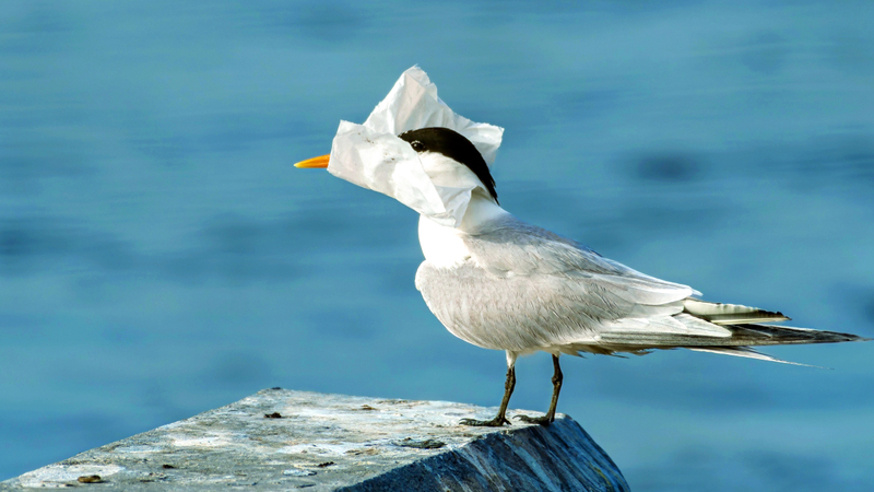 • العمل الفائز بمسابقة «بيئي»، للمصور البحريني زكريا عمران، بعنوان «العمى البلاستيكي»، يُوثّق طائر النورس فاقداً للرؤية بسبب كيسٍ بلاستيكي ملفوف حول رأسه.