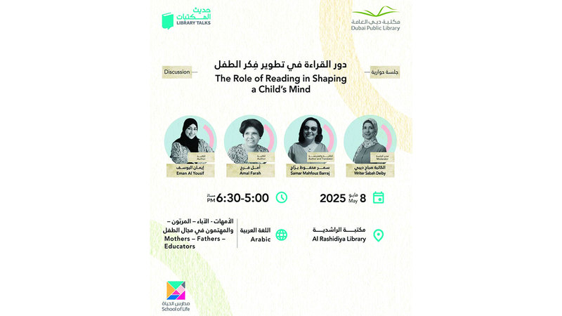 وتتناول جلسة «دور القراءة في تطوير فكر الطفل» التي ستعقد في 8 مايو المقبل في مكتبة الراشدية العامة، وتستضيف فيها الكاتبة والمترجمة سمر محفوظ برّاج، والمؤلفة والشاعرة أمل فرح، والكاتبة إيمان اليوسف، أثر القصص في تنمية شخصية الطفل، ودور العائلة في ترسيخ حب القراءة لديه، وأهمية القراءة للصغار في المراحل المبكرة. كما تشمل الجلسة التي ستتولى إدارتها الكاتبة صباح ديبي عرضاً لطرق وأساليب عملية تسهم في جعل القراءة تجربة ممتعة لدى الصغار، ما يسهم في صقل مهاراتهم اللغوية والفكرية.