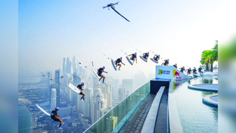 احتضنت سماء دبي سابقة عالمية مذهلة، حققها رائد رياضة التزلج المائي الحر على اللوح، «ويك سكيت»، وبطل العالم ثلاث مرات الأميركي براين جراب، حيث جمع بين رياضتَي «درون ويك سكيت» و«بايس جامبينغ»، منطلقاً من الجسر المعلق العلوي لمنتجع شاطئ العنوان في دبي، حيث يمتد أطول مسبح مترامي الأطراف في العالم.