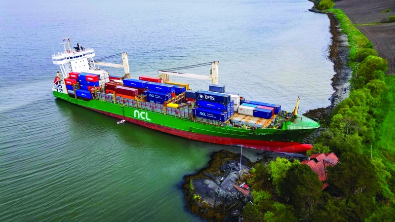 وبعد ساعات قليلة، ظلت سفينة الحاويات راسية بالقرب من المنزل الخشبي، في انتظار إعادة تعويمها.