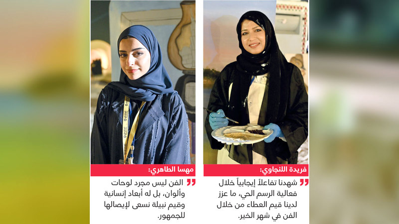 أشارت فريدة اللنجاوي التي شاركت بالرسم على الحاوية المخصصة لفريج جميرا، باستمتاعها بالعمل في هذه المبادرة التي جسدت روح التعاون والعطاء التي يحرص عليها أبناء المجتمع الإماراتي، منوهة بالتفاعل الكبير الذي شهدته خلال مشاركتها في المهرجان، لاسيما من خلال العمل والرسم الحي الذي لقي تفاعلاً إيجابياً من الجمهور، الأمر الذي يعزز قيم العطاء لدى الفنانين، ورسالتهم في دعم الفعاليات والمبادرات الخيرية والإنسانية، لاسيما في شهر رمضان، بينما أشارت مهسا الطاهري خلال مشاركتها في المبادرة إلى الدور الكبير الذي يلعبه الفن والفنانون في ترك أثر إيجابي لدى المجتمع، ودعم الرسائل الإنسانية، لاسيما خلال عملها مدربةً في مجال العلاج بالفن، إذ أشارت إلى أهمية الفن في التعبير عن الذات ونشر الرسائل الإيجابية لدى أفراد المجتمع من مختلف الأعمار، وأضافت: «نسعى من خلال هذه المبادرة إلى إضافة لمساتنا الفنية على حاويات الملابس، بالتعبير عن كل فريج من خلال الرسم»