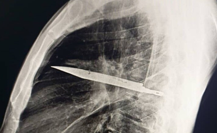 ونشر أطباء مستشفى موهيمبيلي الوطني في تنزانيا مؤخرًا دراسة حالة غير عادية في مجلتهم العلمية “المكتبة الوطنية للطب”. وشرحوا حالة رجل يبلغ من العمر 44 عامًا يتمتع بصحة جيدة بشكل عام جاء إلى المستشفى بتاريخ طويل من إفرازات صديدية بيضاء من حلمة ثديه الأيمن. وقال التقرير أن المريض أنكر أي ألم في الصدر أو صعوبة في التنفس أو سعال أو حمى، لكنه سُئل عما إذا كان لديه أي شيء جدير بالذكر ليخبر الأطباء، فتذكر مشاجرة عنيفة قبل ثماني سنوات، أصيب خلالها بعدة جروح في وجهه وظهره وصدره وبطنه، حيث تمكن الأطباء من خياطة الجروح آنذاك، وعاش حياة هادئة في الغالب منذ ذلك الحين، حتى بدأت حلمة ثديه تفرز صديدًا. ولم يتمكن الأطباء من تحديد السبب، فأمروا بإجراء فحص بالأشعة السينية، ليصدموا برؤية نصل سكين ضخم عالق في صدر الرجل. وكتب الأطباء في دراسة الحالة: “أظهر التصوير الأولي بالأشعة السينية الجانبية للصدر وجود جسم معدني عالق في منتصف الصدر، مع وجود تعتيم محيط به، يُحتمل أن يُمثل ورمًا دمويًا موضعيًا مزمنًا أو تليفًا ما بعد الصدمة، وهو أحد مضاعفات طعنة المريض“.
