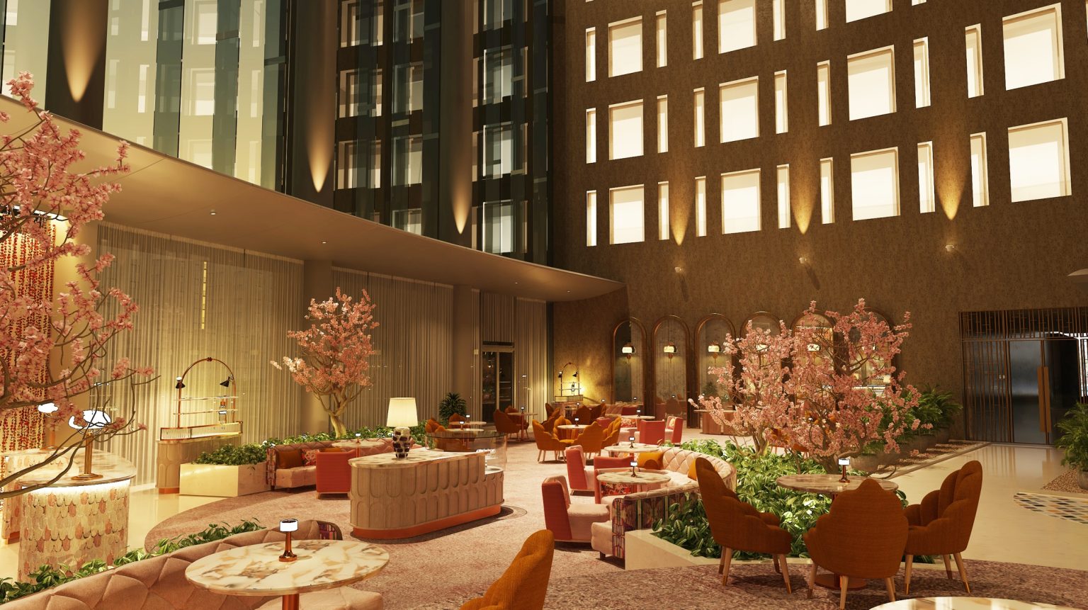 فور وصولهم، يدخل الضيوف إلى بهو الفندق الشاهق الذي يتسم بجدران زجاجية وتصميم مقوّس على شكل عين الإله الفرعوني رع. وكالعادة، تخطف ساعة والدورف أستوريا الأيقونية الأضواء، باعتبارها سمةً من السمات التي تتميّز بها فنادق والدورف أستوريا حول العالم، فتستعرض الوقت داخل حلقتَين من المياه المتدفّقة لتستحضر إلى الأذهان نهر النيل والهندسة المعمارية الفرعونية.