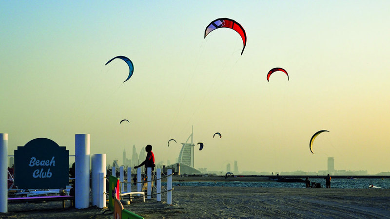 قبيل غروب الشمس، وعلى أحد شواطئ دبي الجميلة، وتحديداً «كايت بيتش» اقترب وقت طيّ الشراع والرحيل، حيث يستعد محبو رياضة التزلج، لإنهاء مغامراتهم، بعد نهار استمتعوا فيه بركوب الأمواج ومياه البحر الفيروزية والرمال الناعمة بجوار برج العرب، وممارسة هوايتهم المفضلة التي تحتاج إلى لياقة عالية، ومهارة خاصة، وأجواء مناسبة: هواء وماء.