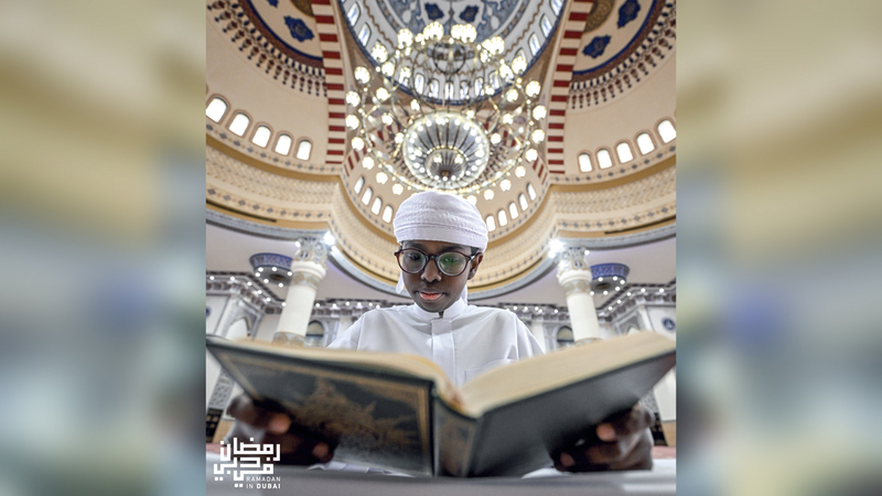 بسكينة تناسب جلال الشهر الفضيل، وبوقار يتخطى سنوات العمر اليافع، وفي رحاب النور، وتحت قبة أحد جوامع دبي العامرة، مسجد الفاروق عمر بن الخطاب.. جلسة بصحبة سور القرآن وآياته، وتدبّر معاني الذكر الحكيم، وربما محاولة لإتمام جزء من كتاب الله، من أجل السعي الحثيث إلى ختم القرآن خلال شهر رمضان المبارك، الذي يكمل ثلث الرحمة اليوم، ليدخل الصائمون إلى أيام المغفرة.