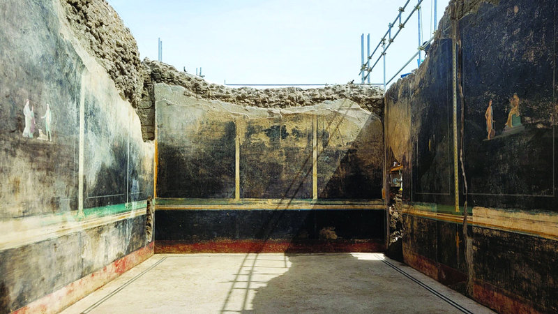 وفي هذه القاعة «كانت تُقام ولائم بعد غروب الشمس، وكان ضوء الفوانيس الخافت يعطي الانطباع بأن الصور المرسومة تنبض بالحياة»، على ما أوضح مدير موقع بومبيي الإيطالي- الألماني غابرييل زوتشتريغل.