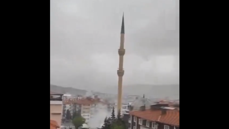 مئذنة ضخمة تسقط أرضاً بسبب العاصفة الجوية في تركيا (شاهد الفيديو)