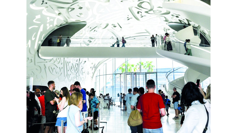 سياح وزوار في «متحف المستقبل» بدبي يتأملون زخرفات الخط العربي في سقف المتحف، خلال جولتهم وسط عالم مدهش، يستحضر الماضي والحاضر والمستقبل، في تجربة تفاعلية تجمع بين التكنولوجيا، والتصميم، والرؤى المستقبلية.