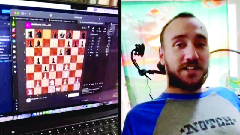 ويظهر نولاند آربو، المريض البالغ من العمر (29 عاماً) والذي أصيب جسده بالشلل بداية من أسفل الكتف بعد تعرضه لحادث أثناء الغوص، وهو يلعب الشطرنج على جهاز الكمبيوتر المحمول الخاص به، ويحرك المؤشر باستخدام شريحة «نيورالينك» خلال البث أول من أمس الأربعاء.