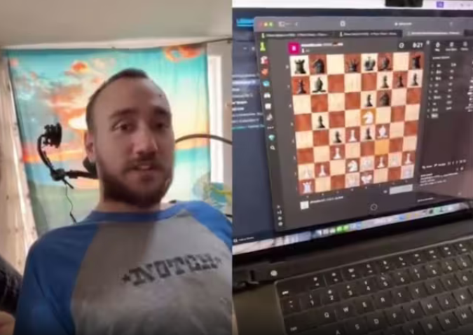 ويظهر نولاند آربو، المريض البالغ من العمر 29 عاما والذي أصيب جسده بالشلل بداية من أسفل الكتف بعد تعرضه لحادث أثناء الغوص، وهو يلعب الشطرنج على جهاز الكمبيوتر المحمول الخاص به ويحرك المؤشر باستخدام شريحة نيورالينك خلال البث أمس الأربعاء.