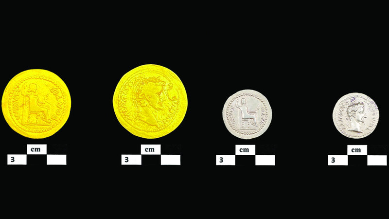 جدير بالذكر بأنه تم العثور على هذه العملات الذهبية التي تحمل صورة الإمبراطور الروماني «تيبيريوس» الذي حكم الإمبراطورية الرومانية في الفترة من 14 م إلى 37 م داخل جرة صغيرة من الفخار، إضافة إلى مجموعة أخرى من العملات البرونزية مستوحاة من العملة المعروفة باسم «أبيل» والتي تم سكها محلياً وأيضاً سوار من البرونز.
