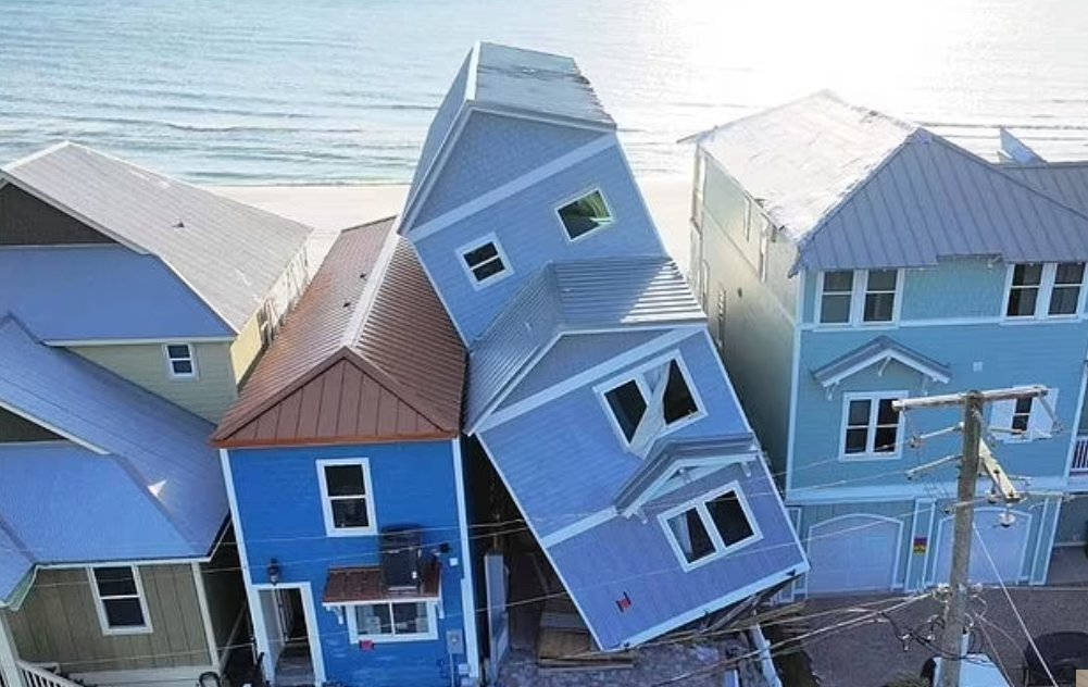ويبدو المنزل الذي تبلغ تكلفته مليون دولار والمكون من ثلاثة طوابق في بنما سيتي بيتش كما لو أنه يتكئ حرفيا الآن على المنازل المجاورة، لكن أصحابه يرفضون هدمه، وفقًا لشكوى تم تقديمها في وقت سابق من هذا الشهر.