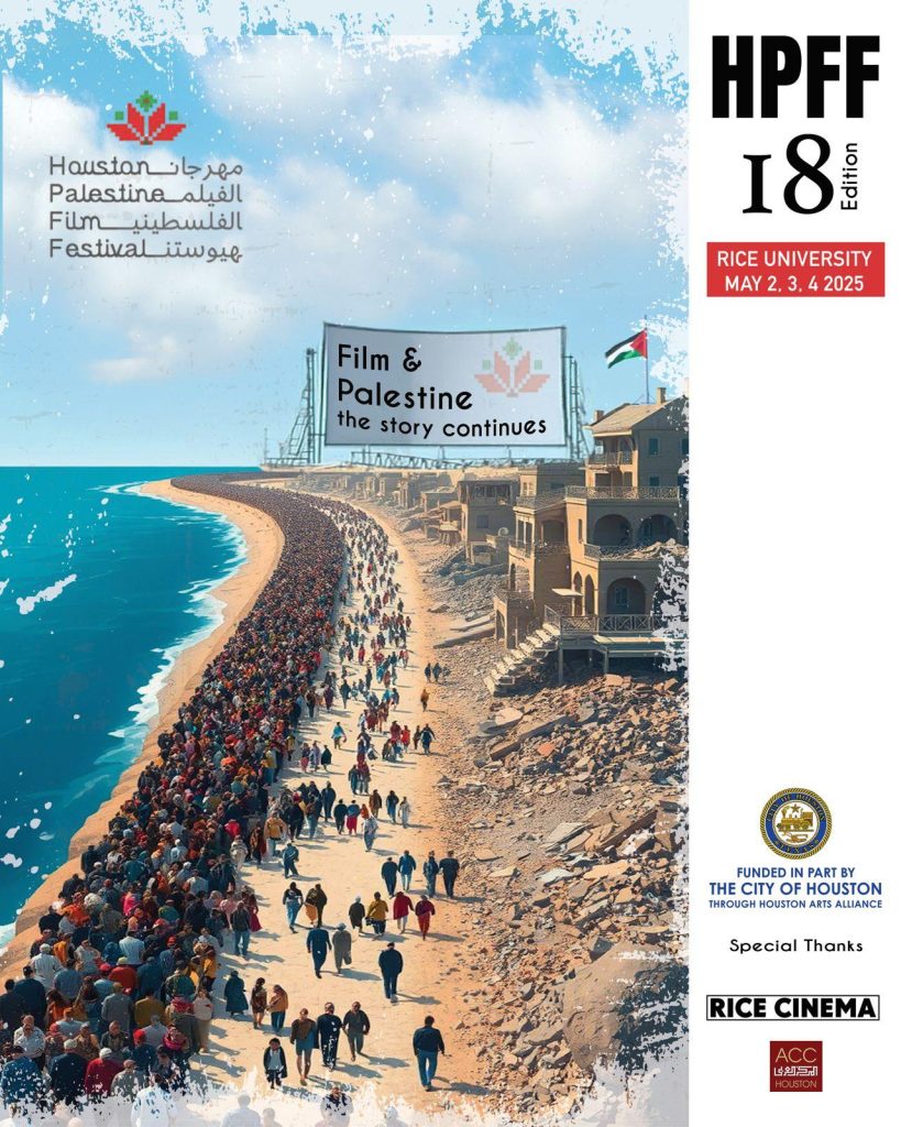 يُقام مهرجان هيوستن الفلسطيني للأفلام (HPFF)في دورته الثامنة عشرة خلال الفترة من 2 إلى 4 مايو 2025 في جامعة رايس، بمدينة هيوستن الأمريكية، في ولاية تكساس مقدمًا للجمهور مجموعة مختارة من الأفلام الفلسطينية والعربية. وعلى مدار ثلاثة أيام، سيعرض المهرجان نحو 20 فيلمًا طويلًا وقصيرًا، إلى جانب برامج خاصة من فلسطين ولبنان والأردن وسوريا، حيث ينقل رؤى حميمية وقوية عن الحياة في المنطقة من خلال عدسات صانعي  الأفلام المستقلين.
