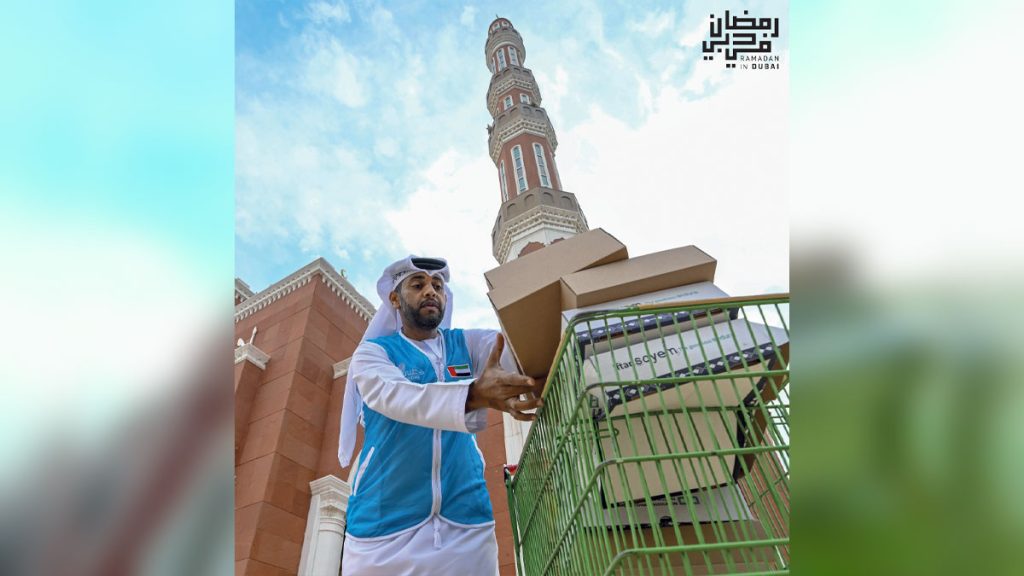 في ظلال المئذنة السامقة، ومن رحاب مسجد السلام في منطقة البرشاء بدبي، وبهمّة صائم يسعى لمضاعفة الأجر خلال شهر البركات، والإسهام في إبراز وجوه الخير والتعاضد في المجتمع.. متطوع يتزين بشعار «وطني الإمارات» يسابق الزمن من أجل إنجاز المهمة في موعدها المحدد، بتوزيع الوجبات على ضيوف موائد الرحمن.