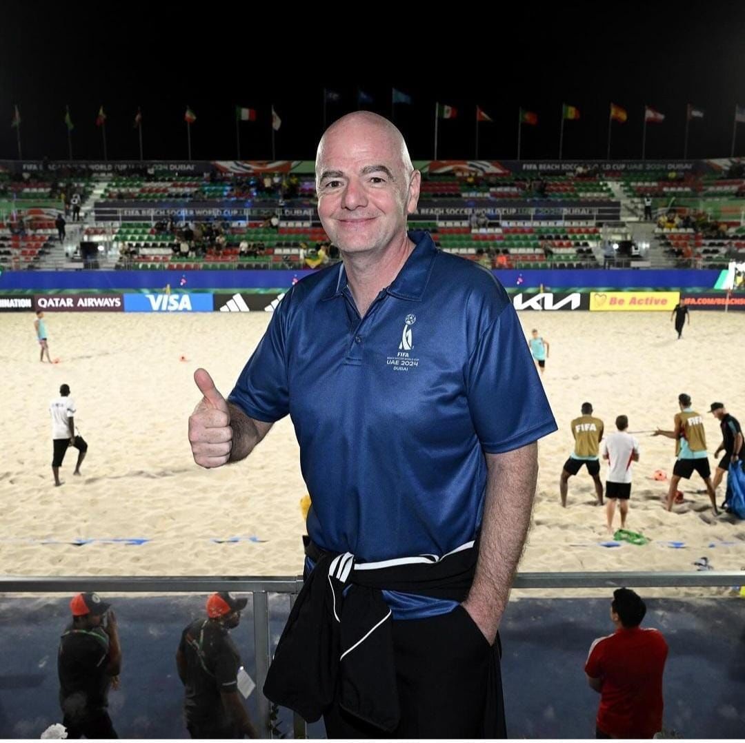 وكان رئيس الفيفا قد حضر، أمس الأحد، جزءا من منافسات اليوم الرابع من بطولة كأس العالم لكرة القدم الشاطئية “الإمارات 2024” التي تستضيفها دبي بمشاركة أفضل 16 منتخباً على ملعب حي دبي للتصميم.