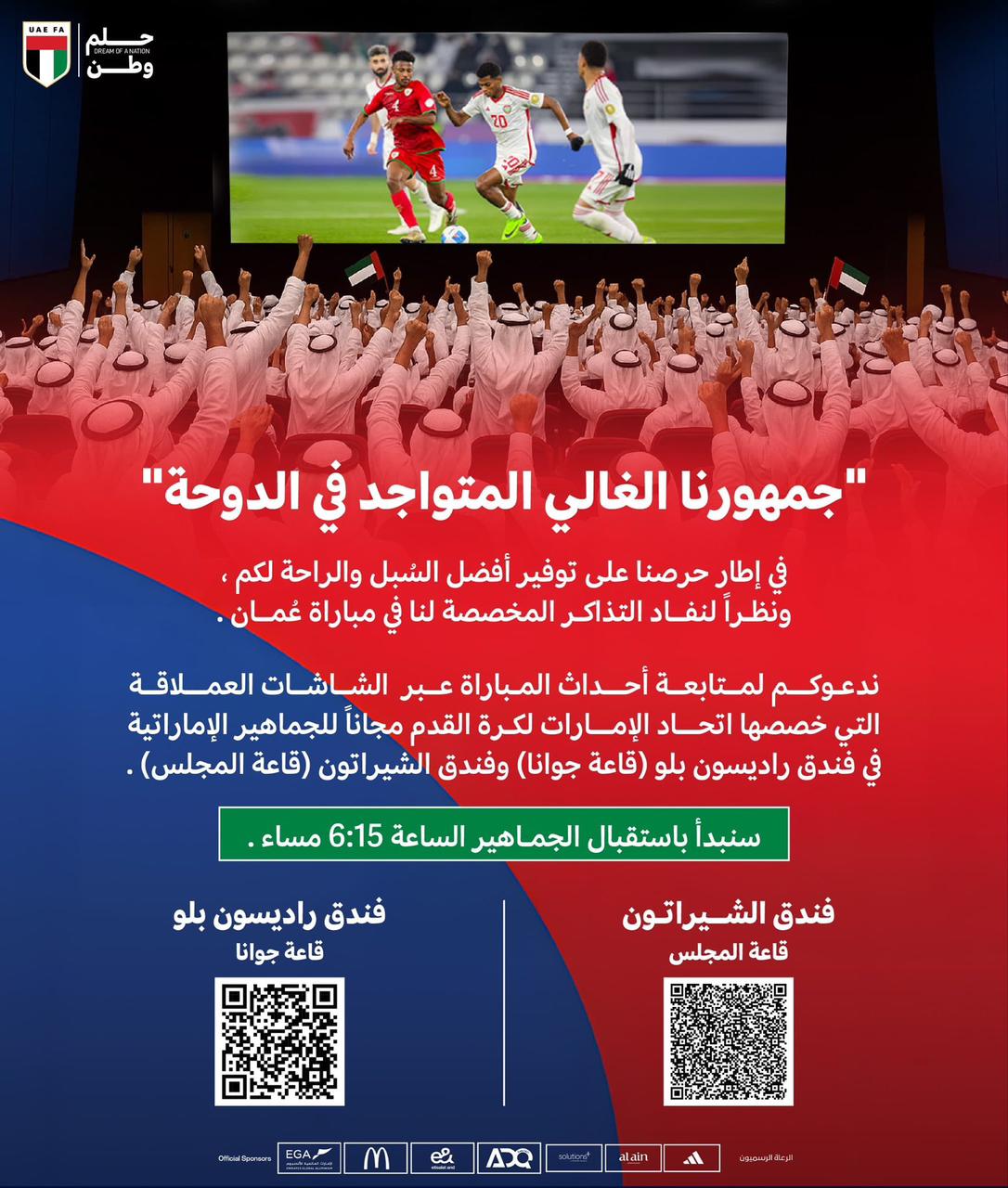 وجّه اتحاد الإمارات لكرة القدم دعوة إلى جماهير المنتخب الوطني المتواجدة في الدوحة، لحضور ومتابعة مباراة الأبيض أمام منتخب عُمان عبر الشاشات العملاقة التي خُصصت لهم مجاناً في قاعة جوانا بفندق راديسون بلو وقاعة المجلس بفندق الشيراتون.