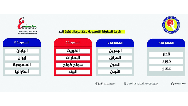 أسفرت قرعة البطولة الآسيوية الـ22 لكرة اليد المؤهلة إلى «مونديال ألمانيا 2027»، والتي ستقام في الكويت يناير المقبل، عن وقوع منتخب الإمارات في المجموعة الثالثة مع منتخبات الكويت صاحب الأرض، والهند وهونغ كونغ. ويشارك في البطولة 15 منتخباً موزعين على أربع مجموعات، حيث تضم المجموعة الأولى فريق قطر حامل اللقب، وكوريا وعُمان، في حين تضم الثانية البحرين والعراق والصين والأردن، وتضم الرابعة اليابان وإيران والسعودية وأستراليا، ويتأهل أصحاب المركزين الأول والثاني من كل مجموعة إلى الدور الرئيس الذي يضم ثمانية منتخبات سيتم توزيعها على مجموعتين تلعبان بنظام الدوري، ويتأهل منهما صاحبا المركزين الأول والثاني إلى الدور نصف النهائي، إضافة إلى التأهل مباشرة لبطولة العالم 2027 المقررة في ألمانيا.