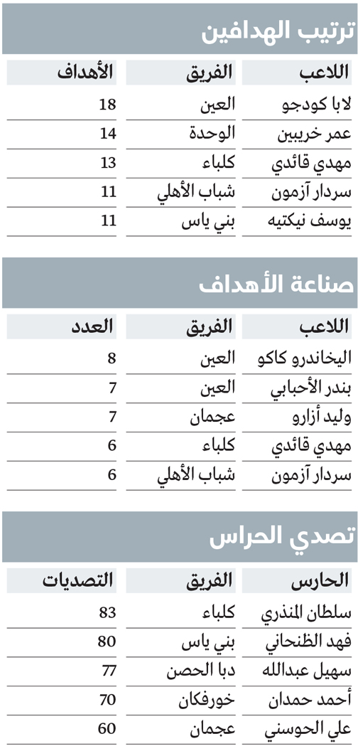 يواصل لابا كودجو نجم العين هيمنته على صدارة الهدافين برصيد 18 هدفاً، رغم صيامه عن التسجيل في آخر جولتين. لابا لايزال متفوقاً بفارق مريح (أربعة أهداف) عن أقرب ملاحقيه عمر خريبين (14 هدفاً)، ويؤكد حضوره كأخطر مهاجمي البطولة بتصدره أيضاً قائمة أكثر اللاعبين تسديداً على المرمى (81 تسديدة).