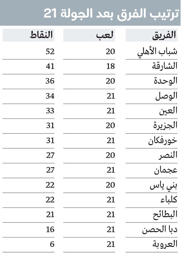 ويتصدر «فرسان دبي» جدول ترتيب الدوري برصيد 52 نقطة، وأمامه فرصة تحقيق لقب الدوري بلا هزيمة، إذ تبقت لديه ست مباريات فقط حتى نهاية الموسم.