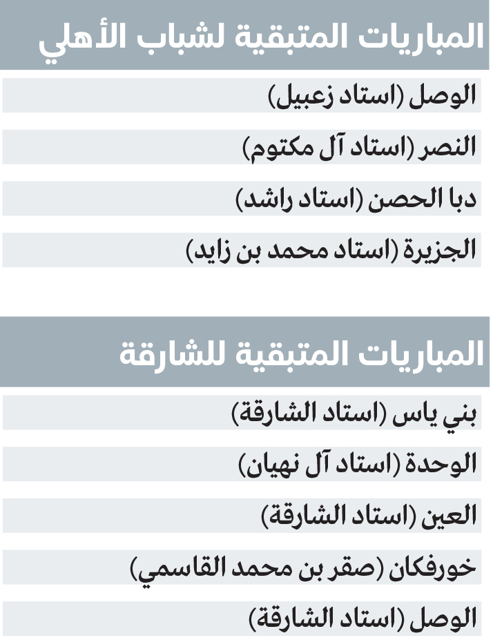 أما في حال انتصار الشارقة بمواجهة بني ياس الخميس المقبل، فإن الحسم سيتأجل إلى الجولة الـ24، والتي قد تشهد سيناريو لا يقل إثارة، ويتعلق بإمكانية حسم شباب الأهلي اللقب في ملعب منافسه التقليدي الآخر فريق النصر في «الديربي القديم».