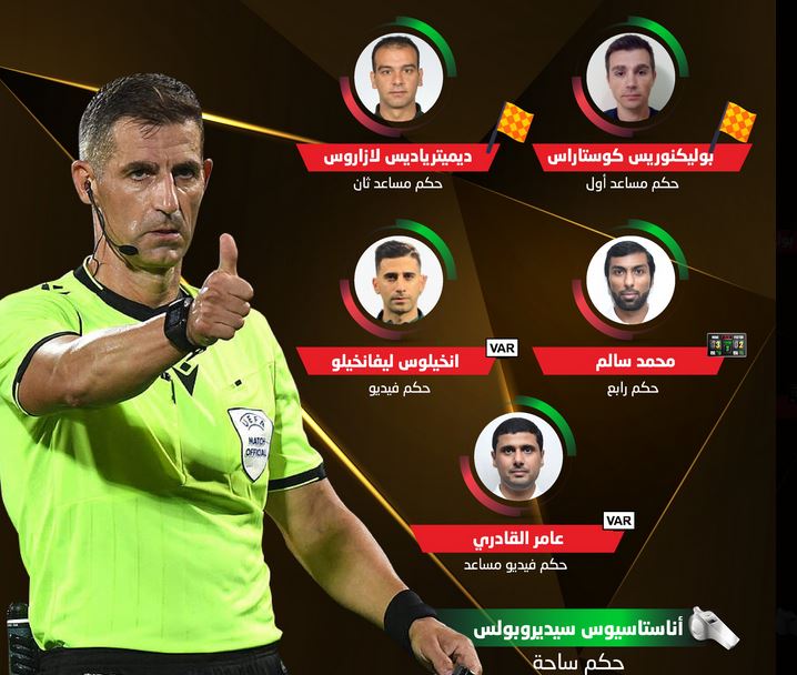 ويضم طاقم التحكيم المساعدين بوليكنوريس كوستاراس وديميتر ياديس لازاروس، إلى جانب محمد سالم حكما رابعا، وانخيلوس ليفانخيلو حكم فيديو، وعامر القادري حكم فيديو مساعد.