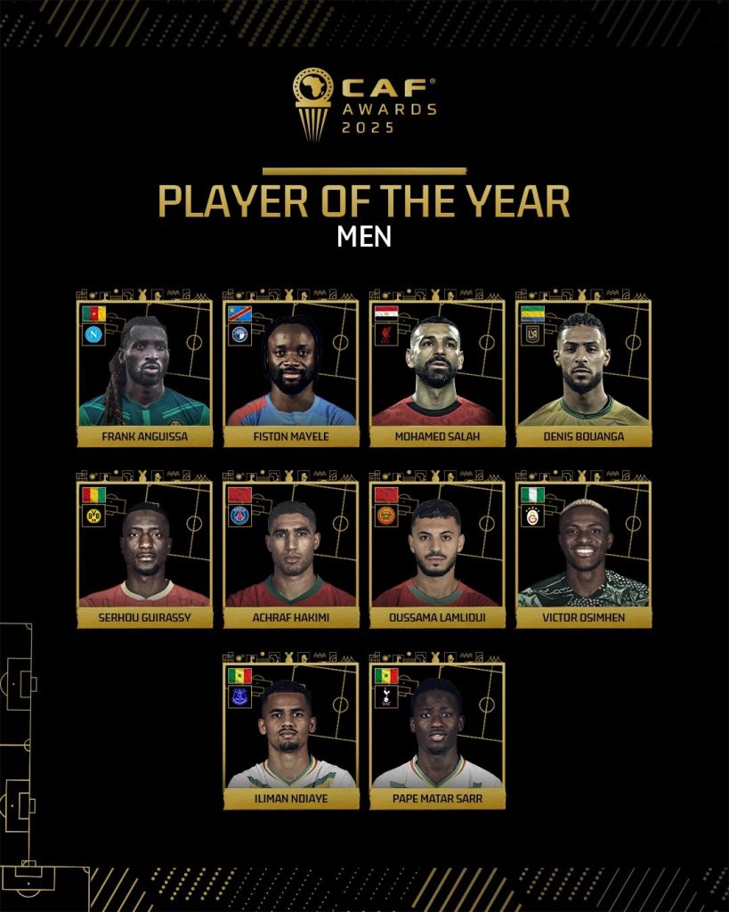 وتبدو المنافسة مستعرة بين نجم ليفربول الانجليزي صلاح الساعي الى الظفر بالجائزة للمرة الثالثة بعد عامي 2017 و2018، ومدافع باريس سان جرمان الفرنسي حكيمي الطامح إليها للمرة الاولى بعدما خسرها في النسختين الاخيرتين أمام النيجيريين فيكتور أوسيمهين عندما كان يدافع عن ألوان نابولي الايطالي وأديمولا لوكمان المتوج مع أتالانتا الايطالي بلقب الدوري الاوروبي «يوروبا ليغ» عام 2024.